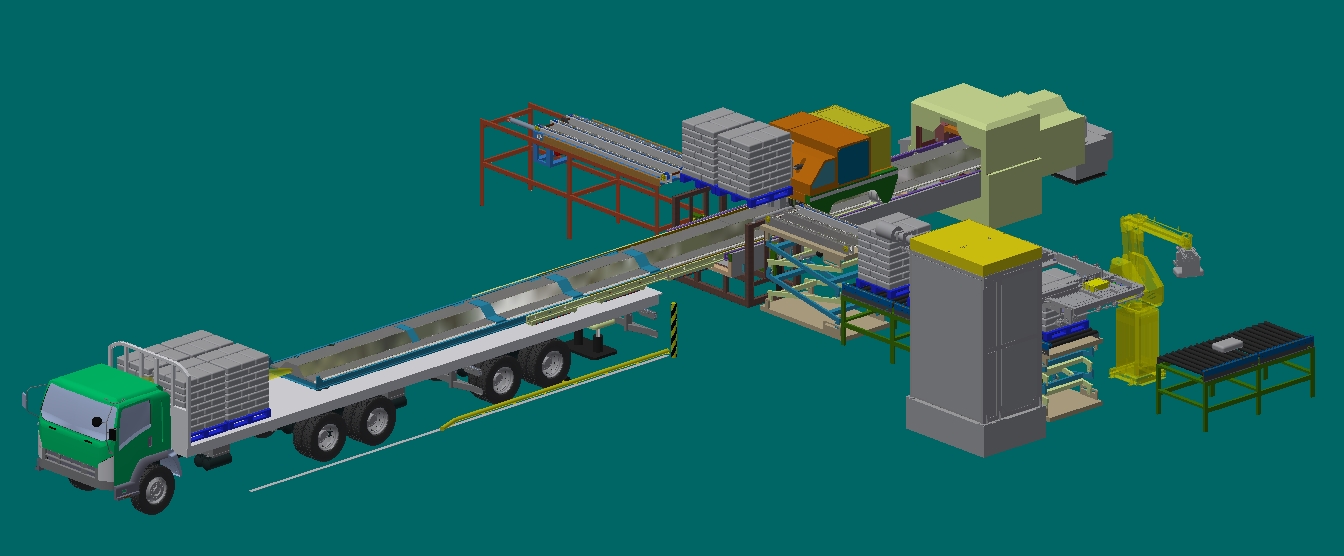 码垛装车:包装物料经输送机送至码垛系统,码垛后输送至箱/袋输送机,经自动送箱/袋叉车,将箱/袋送入车辆或集装箱内,实现自动装车。