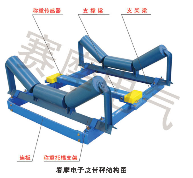 称重桥架上对称装有二组称重托辊支架,支架上的称重托辊将皮带上的物料重量传递给称重传感器。