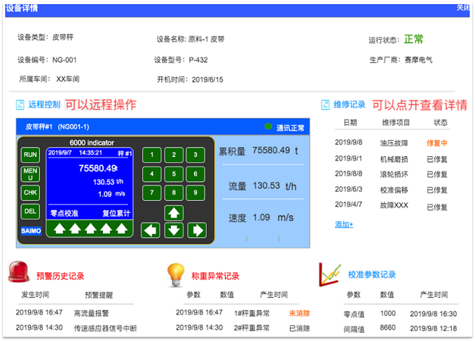 设备台账:设备台账记录设备全生命周期管理,从设备登记、安装日期、设备技术参数、称重标准值、校准记录、告警日志、监控趋势等信息。