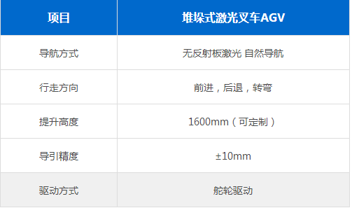 堆垛式激光叉车AGV,用于不同高度平台上的托盘类物料的物流周转,由自然环境激光导航系统、舵轮牵引和转向驱动系统、液压升降系统、安全系统、电源系统等组成,具有导航精度高、性能可靠、性价比高等特点。可广泛应用于汽车、家电、电子、新能源、仓储、医药、电力、烟草等行业