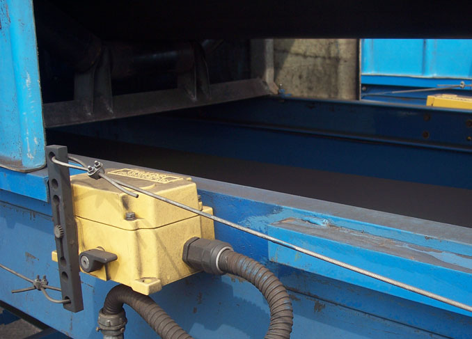 拉线开关通常安装在输送机的两侧,用于设备的紧急停机,以保护人员或设备的安全。拉线开关的钢丝绳一端固定在一个固定的拉线螺栓上,另一端固定在开关臂上,钢丝绳每三米用一个有孔螺栓支撑,开关到固定点的距离不应超过24米,两开关间的距离不应超过48米。当外力促使开关臂杆转动到报警位置时,触动微动开关并锁定,直到人工复位。标准拉线开关防护等级为IP65,适应于室内外安装。表面经特殊处理后可用于酸、碱、盐性区域。镀镍表面用于强腐蚀区域。