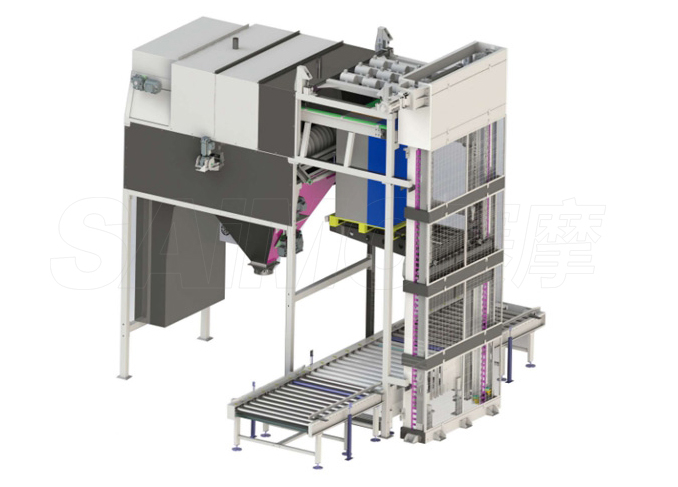 整层拆包投料机是将整托的物料由转运到滚筒输送机上,提升装置将整托提升,通过抓勾装置将一层的物料抓取,经过刀片进行破包投料。